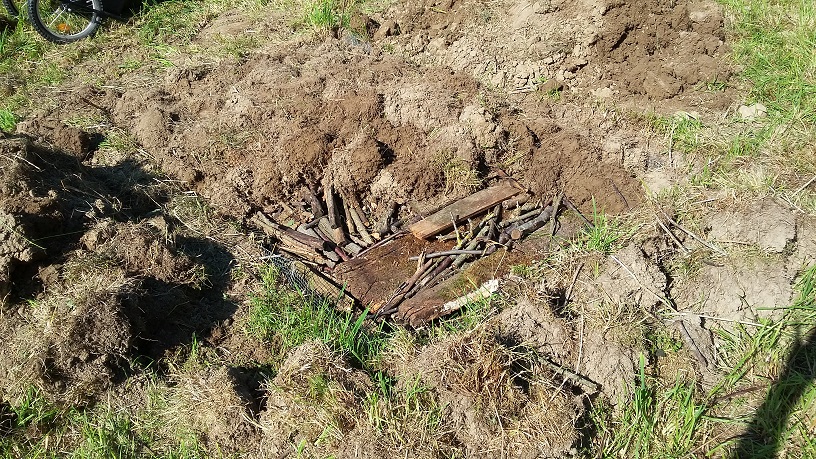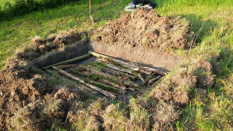 Gegen Wühlmäuse Gitterdraht auslegen und erste Altholzstücke einlegen.