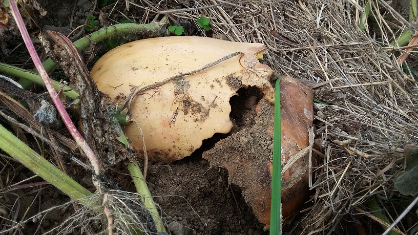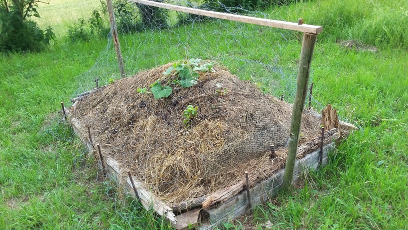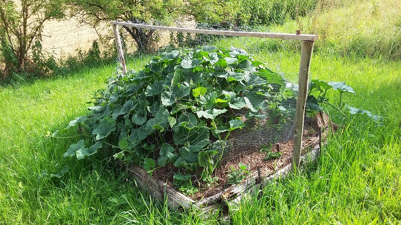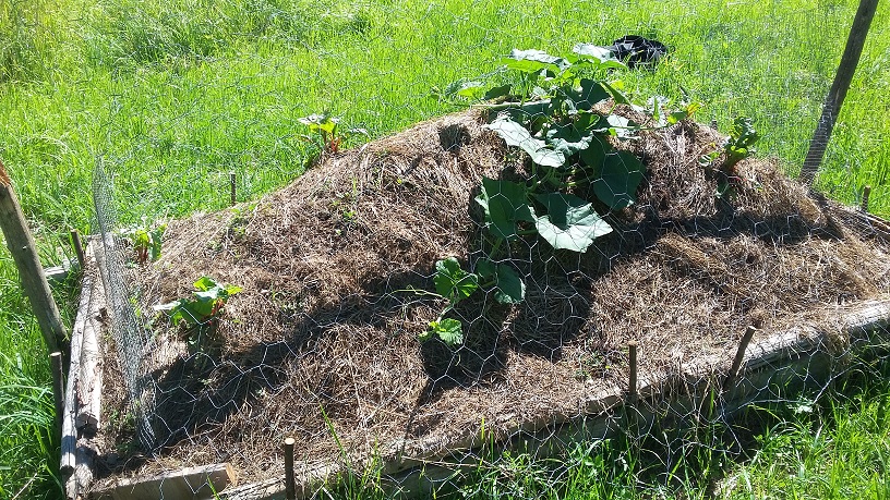 Nachdem ziemlich bald bei Kürbis und Mangold Fraßschäden aufgetreten sind, musste ich das Hügelbeet schützen